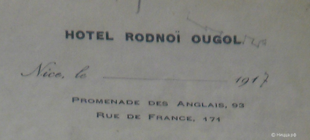 Можно было бы предположить, что между РУ и улицей де Франс находился еще один дом, построенный в том же стиле и сохранился он, а РУ снесен полностью. Но дело в том, что у меня есть документы, в которых указаны два адреса Родного угла, Променад дез Англе и рю де Франс. Т.е. РУ занимал все пространство между этими улицами