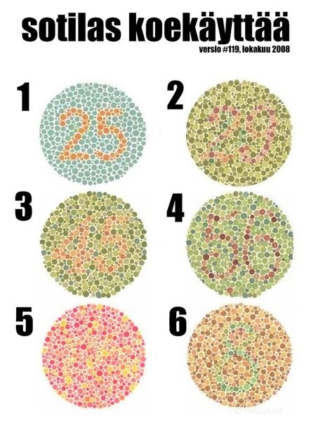Если будущий солдат не видит числа сразу в нескольких кружках, его следует проверить на цветовую слепоту — дальтонизм.