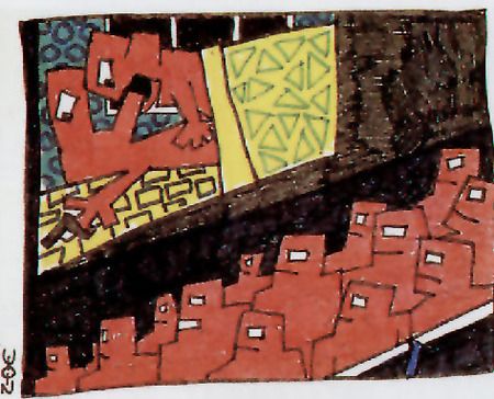 На мой взгляд, падающий боксёр автору ближе. Потому, что публика, и тот, кто бьёт, окрашены одним цветом, тем, которым обозначена агрессия.